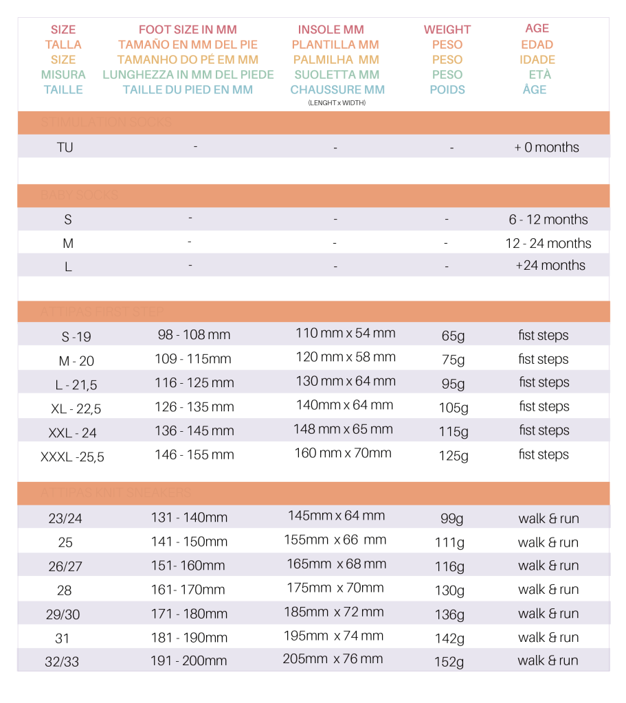 SKIN SHOES, o novo modelo Attipas para bebês que já andam sozinhos. Ideal para correr, pular, escalar e explorar durante a infância. Com o mesmo conceito do Attipas mas evoluindo para as novas necessidades do bebé que agora anda sozinho. Mantém a essência Attipas, flexível, antiderrapante, biqueira larga, sola plana e adequada para lavagem na máquina. E acrescenta ainda novos conceitos adequados à nova fase de crescimento do bebé para promover a sua autonomia, com novo sistema de regulação com velcro e palmilha removível. Disponível em 4 cores, e disponível em 7 tamanhos 23-33.