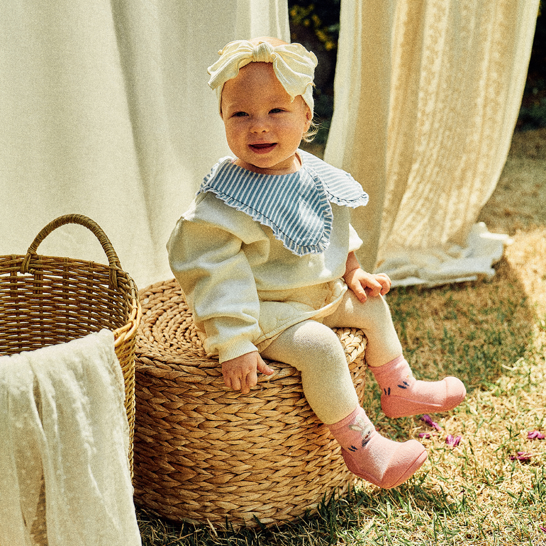 TECIDO DE ALGODÃO COM CERTIFICADO OEKO TEX STANDARD Feito de algodão sustentável e ambientalmente seguro para os pés do seu bebê.