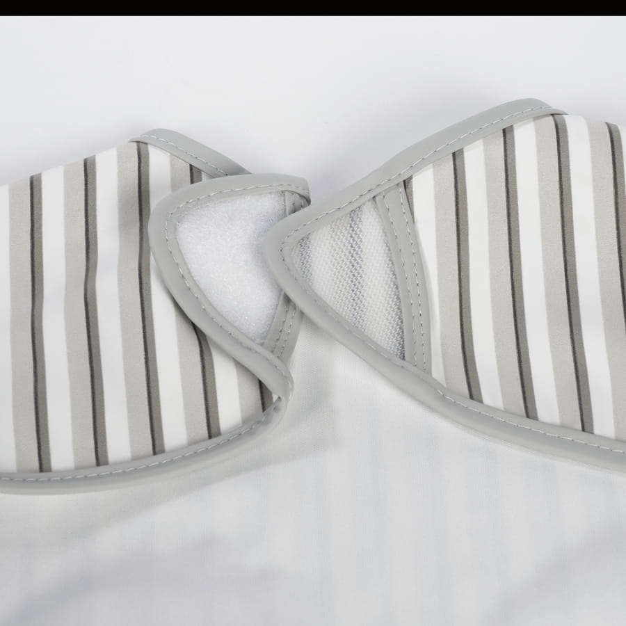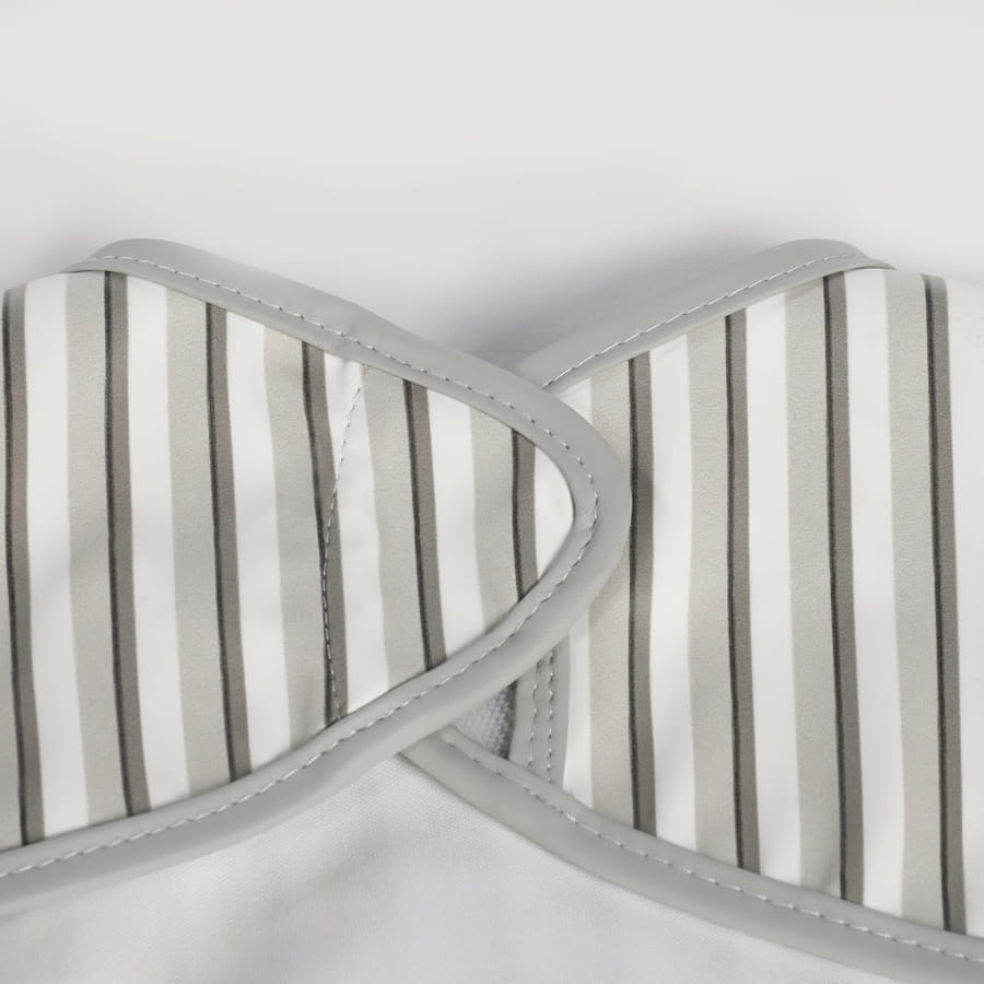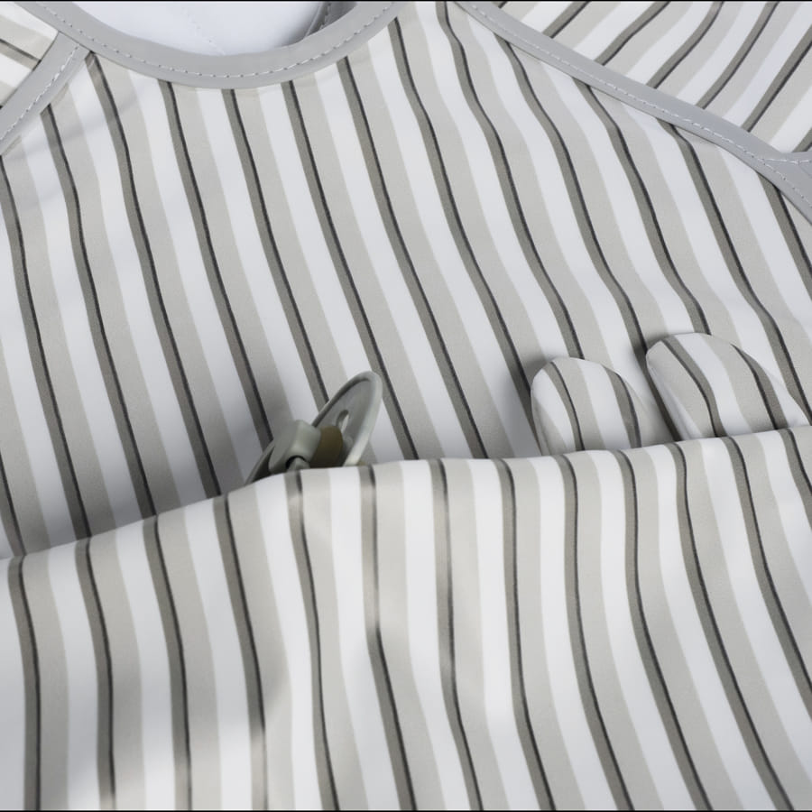 O babete impermeável da coleção Botton Strips da Walking Mum é o acessório ideal para manter a roupa do seu bebé limpa e seca durante as refeições ou atividades criativas.