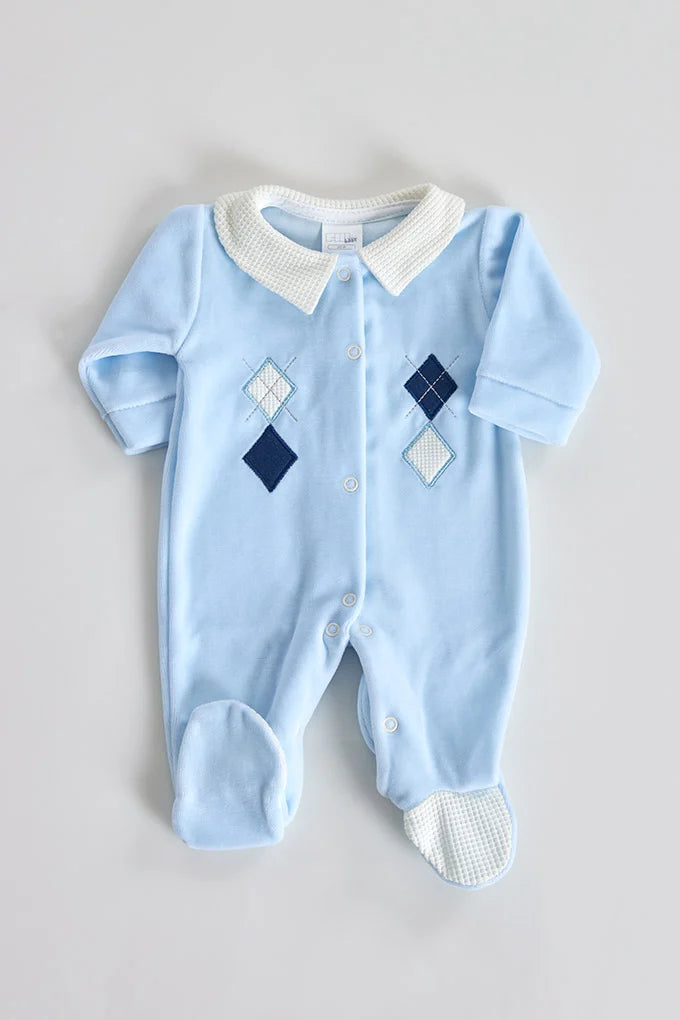 Babygrow com abertura à frente em tecido de veludo com aplicações bordadas e gola piquet, para bebé menino.