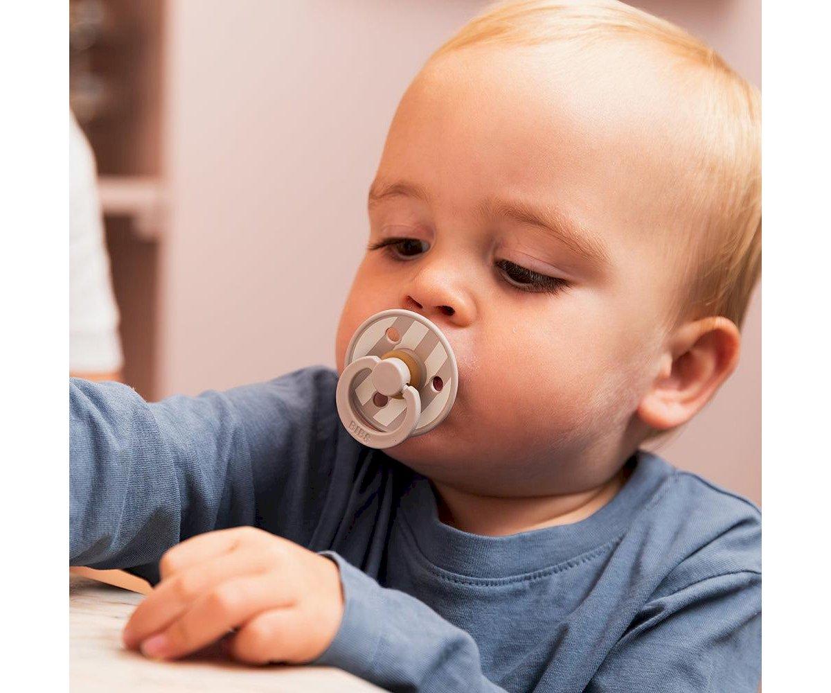 Pacote de 2 chupetas BIBS com design exclusivo, criadas e fabricadas na Dinamarca. Com acabamento fosco e estrutura leve em polipropileno (PP), estas chupetas destacam-se pelas cores tendência e pelo estilo moderno com riscas verticais.