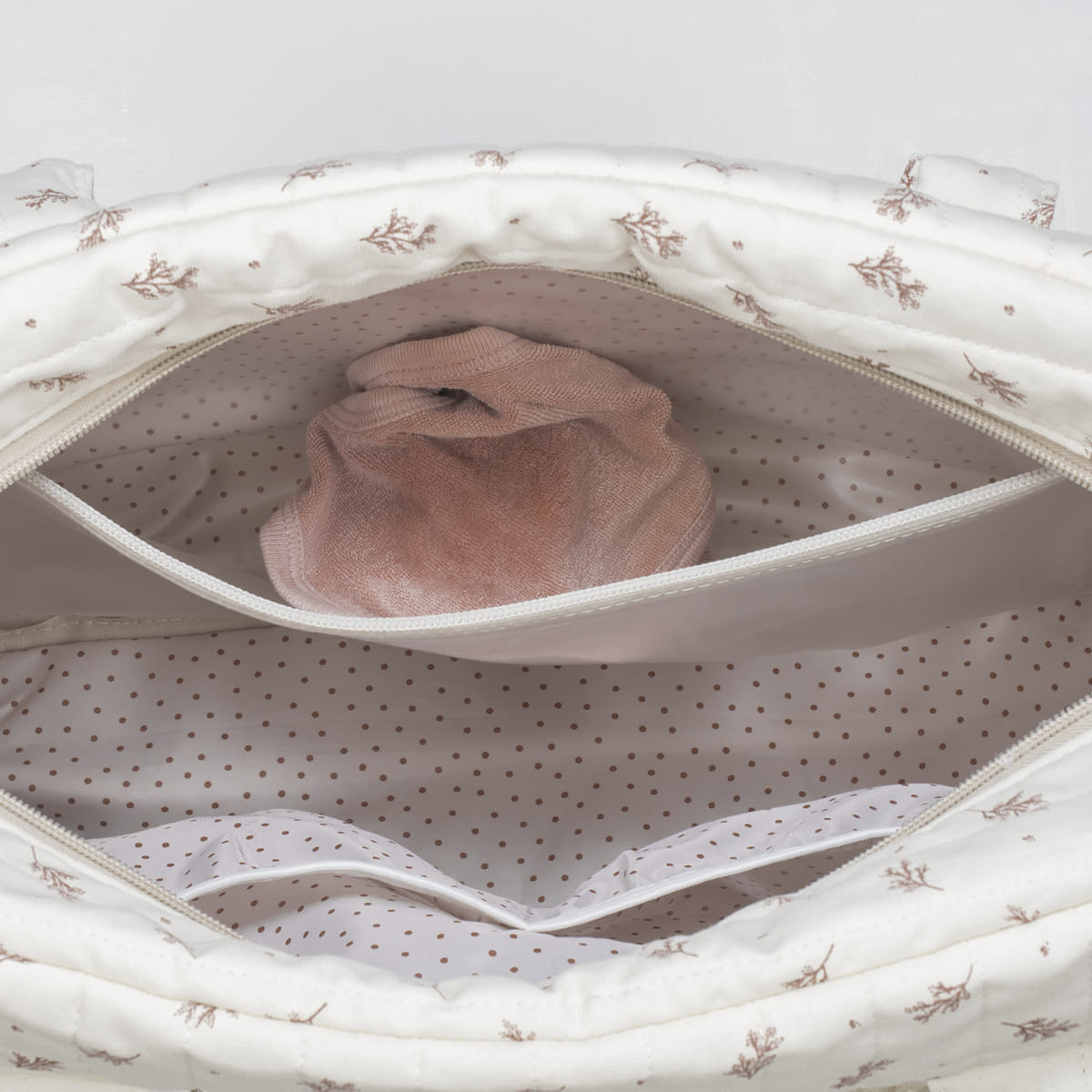 No interior inclui um bolso laminado para roupa molhada, um bolso térmico para garrafas e dois bolsos para o que necessitar de ter à mão. A bolsa possui sistema de fixação universal, com 2 alças curtas ajustáveis ??que facilitam a colocação em qualquer modelo de carrinho. Também possui uma alça longa para pendurá-lo no ombro e alças curtas para segurá-lo com a mão. Ótima qualidade e muito estilo. Fabricado em 100% algodão com tratamento impermeável, fácil de limpar à mão ou à máquina a 30°C. Walking Mum protege o seu bebé com os melhores tecidos, livres de corantes azo e substâncias nocivas à saúde.
