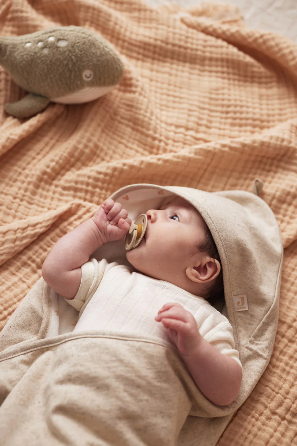 As patas/barbatanas com efeito crepitante são irresistíveis para brincar, enquanto o sino suave escondido na barriga estimula a audição e a curiosidade do bebé.