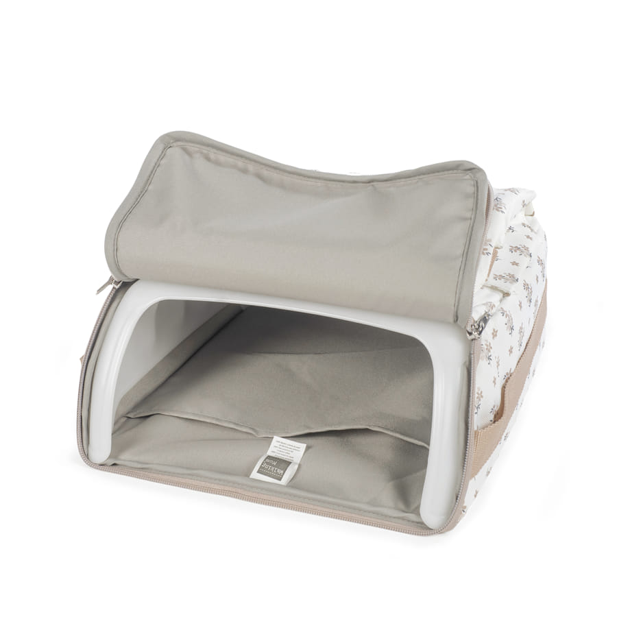 O seu design dobrável facilita o transporte e arrumação, e inclui uma alça de ombro para transportar com conforto. A base possui um compartimento de arrumação prático para fraldas, toalhitas ou outros essenciais.