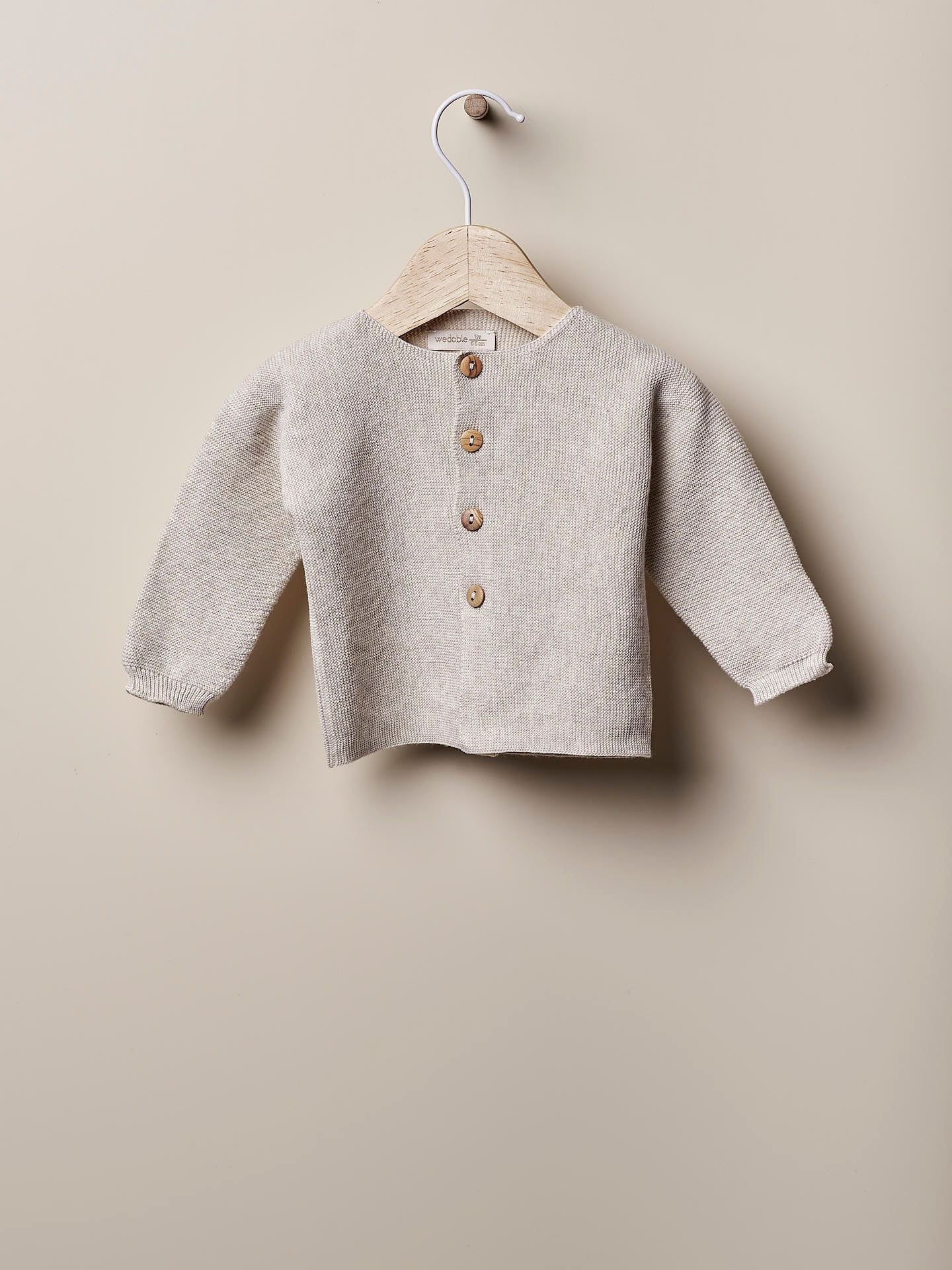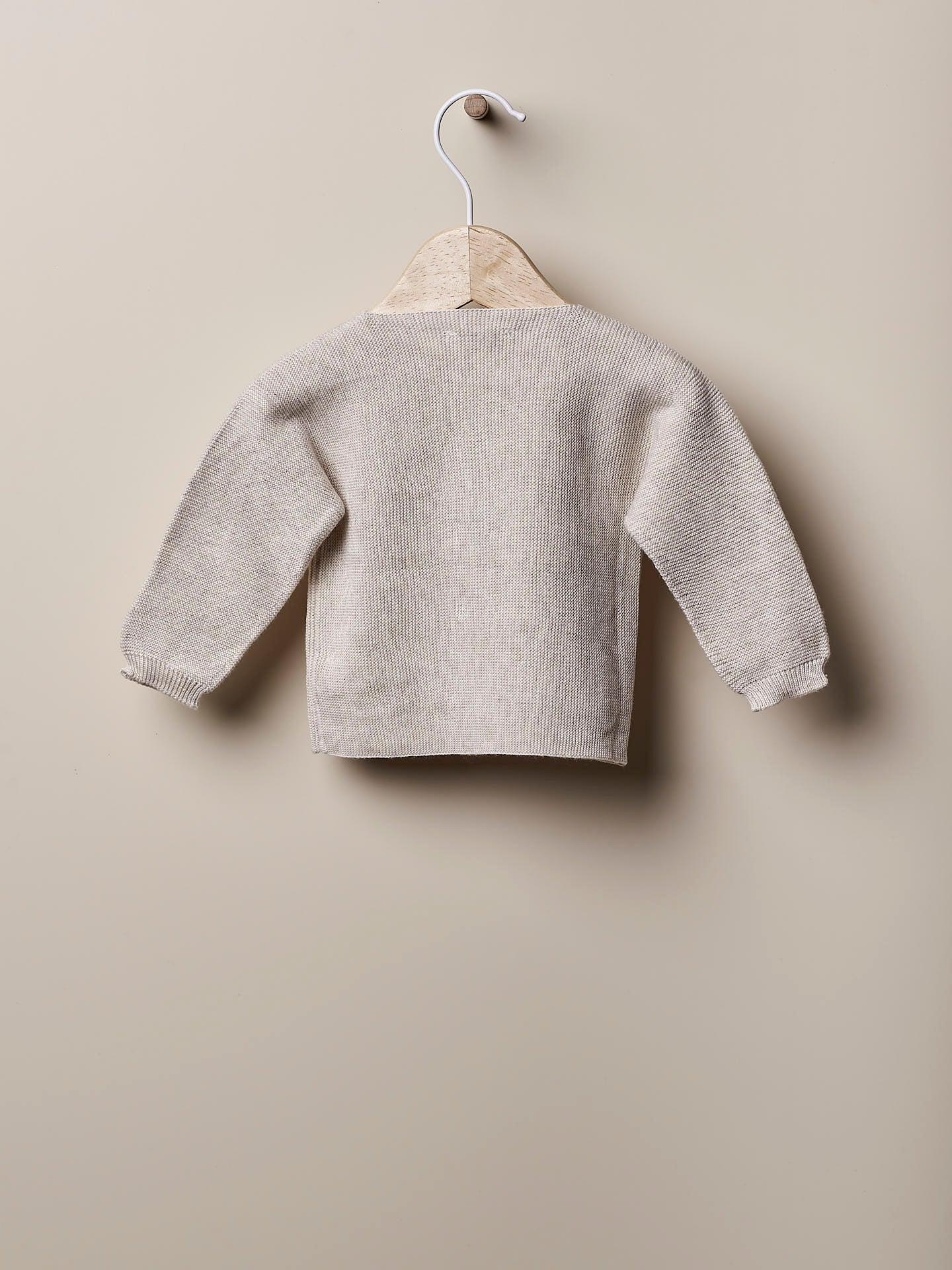 Casaco de manga comprida tricotado em malha de algodão, suave e respirável, ideal para bebés meninos e meninas, até aos 4 anos. O casaco WELLNESS aperta na frente com botões de madeira. Produzida com a tecnologia Wholegarment, esta peça é completa e sem costuras, para maior conforto do seu bebé.