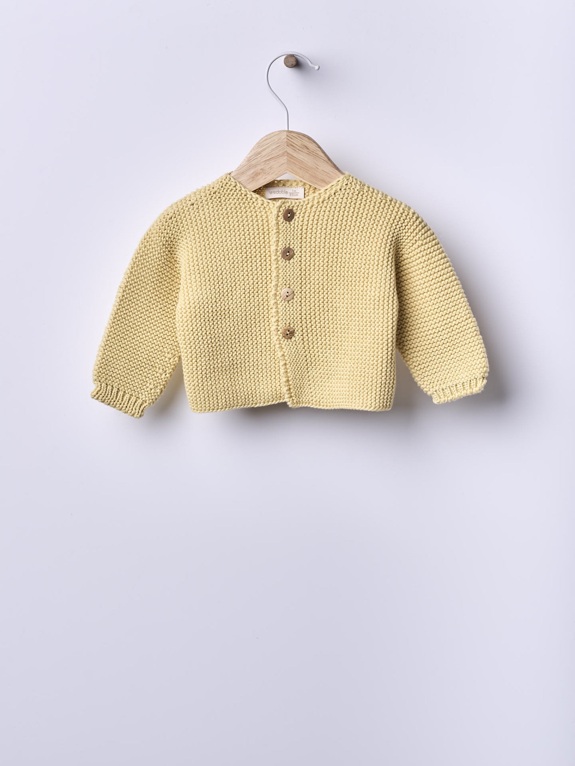 Casaco de manga comprida tricotado em malha de algodão orgânico suave e respirável, ideal para bebés meninos e meninas até aos 4 anos.