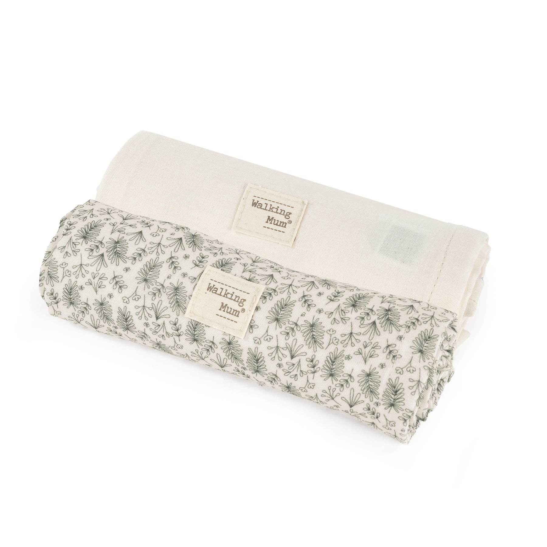 O conjunto inclui duas muselinas coordenadas, uma lisa e outra estampada com o delicado padrão floral Gala Mint, refletindo o estilo contemporâneo e funcional da Walking Mum.
