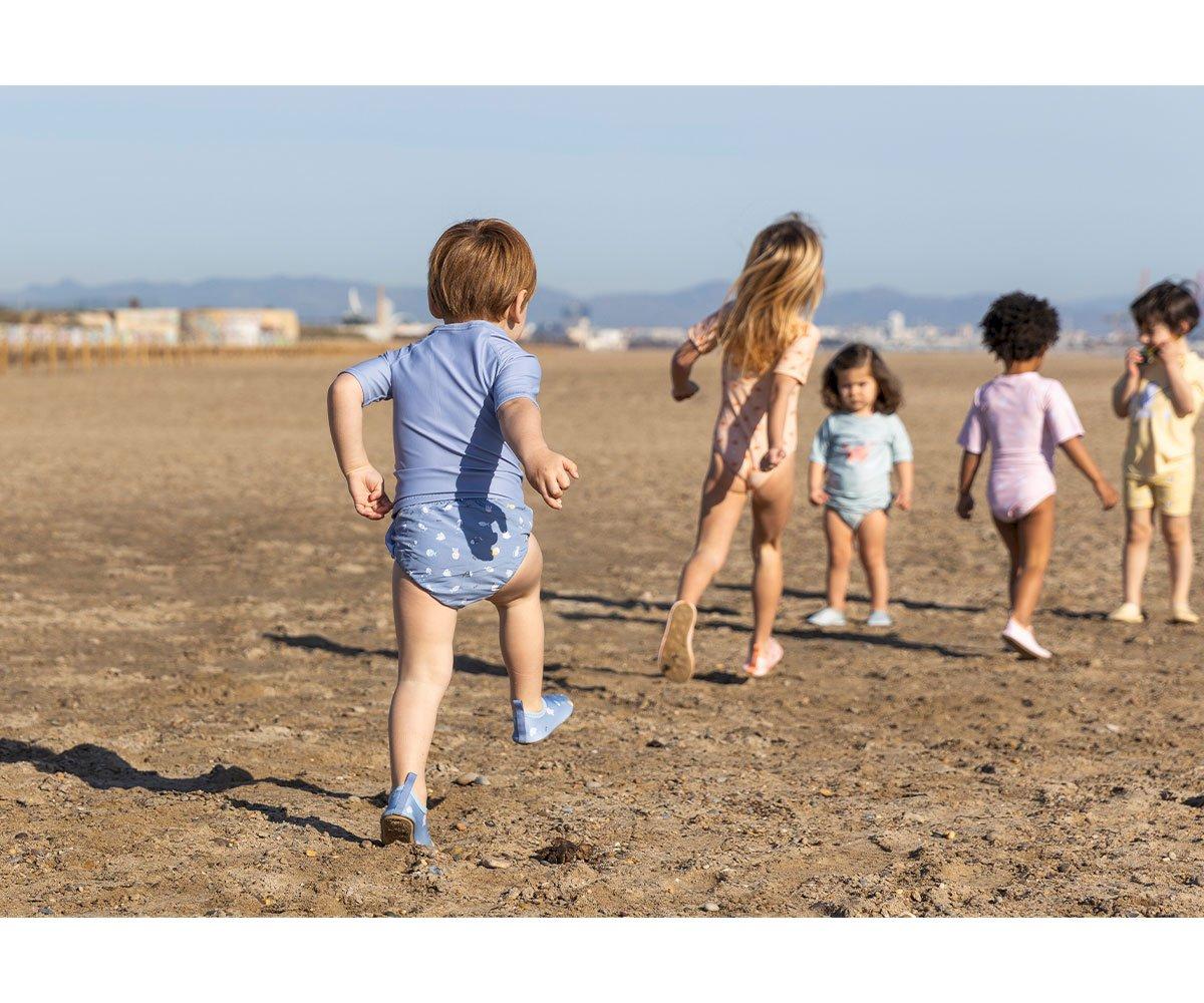cueda fralda da coleção Monnëka by tutete, criada com um tecido especial que protege a pele dos raios solares e evita vazamentos sólidos quando a criança está tomando banho na praia ou na piscina.