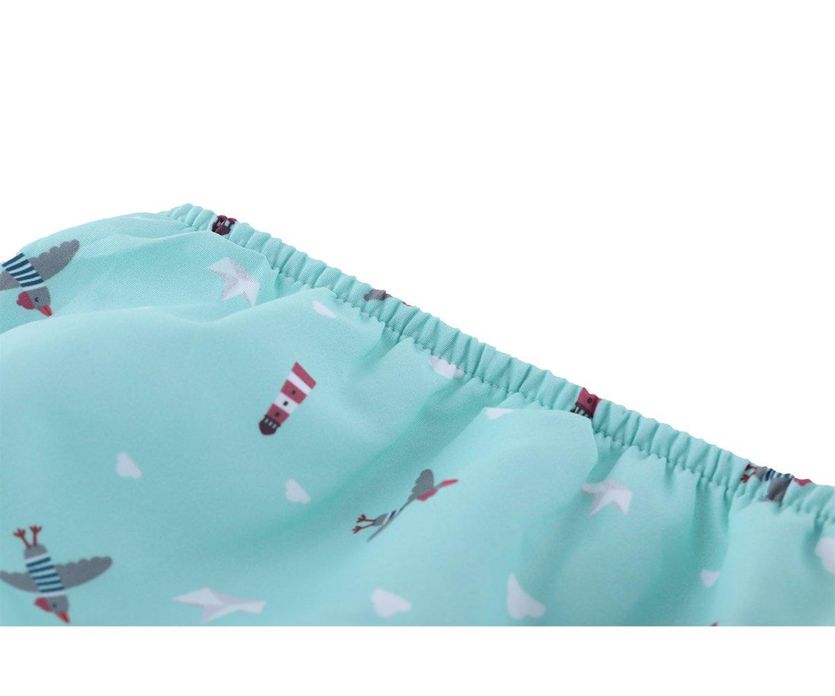 Roupa de banho de fraldas da coleção Lighthouse da Monnëka, criada com um tecido especial que protege a pele dos raios solares e evita vazamentos sólidos quando o pequeno está tomando banho na praia ou na piscina.