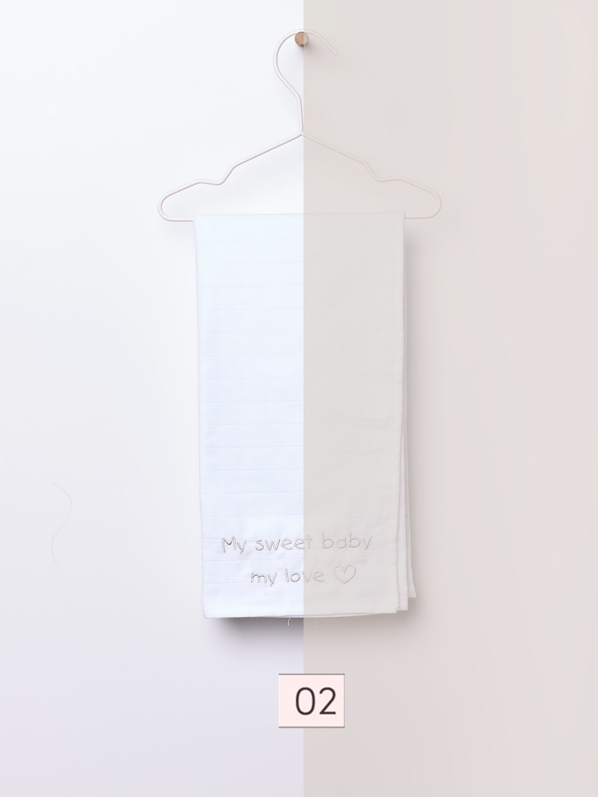 Da Cápsula Mini Bebés, esta fralda de pano branca é bordada com as palavras "My sweet baby", disponível em várias cores. Produzida em algodão suave, é indicada para bebés, meninos e meninas.