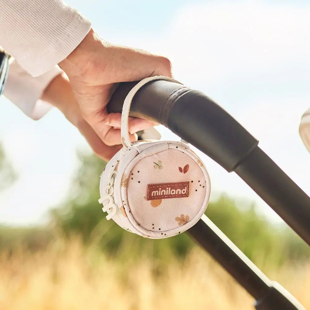 Seu tecido impermeável é fácil de limpar e possui alças internas para segurar a chupeta no lugar quando aberta, evitando que ela caia.