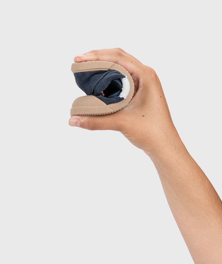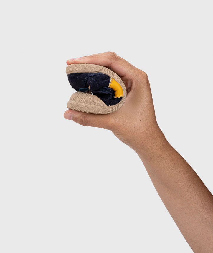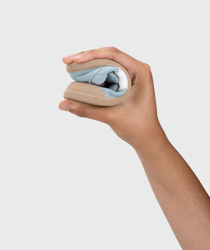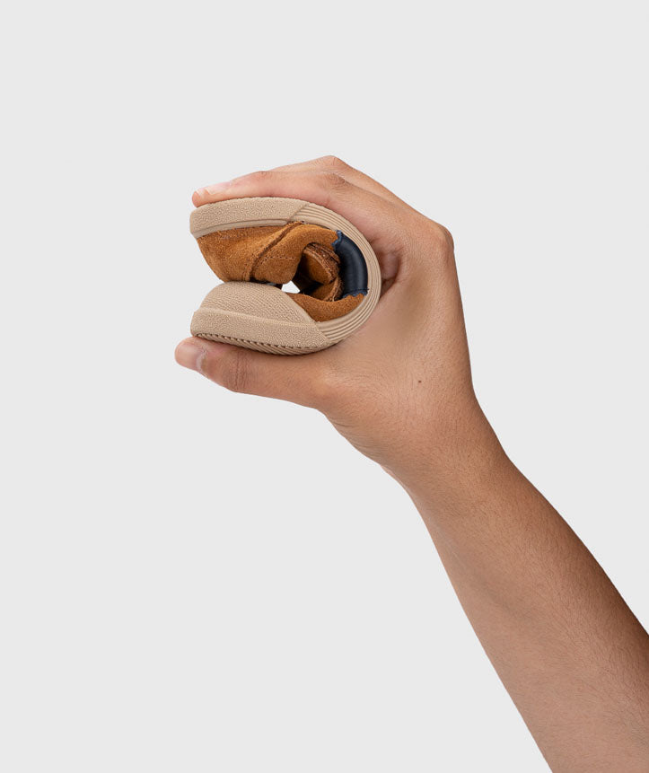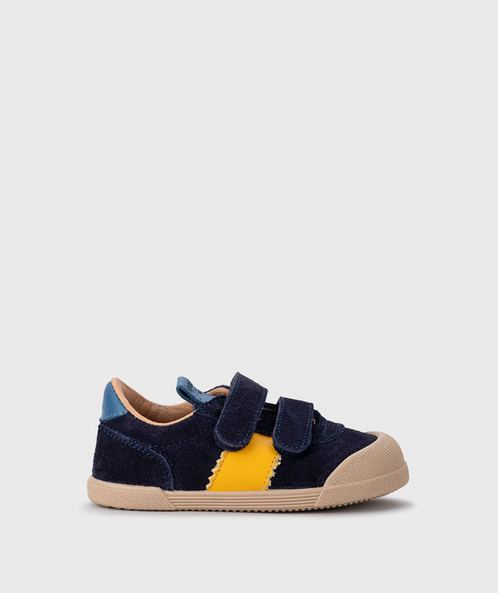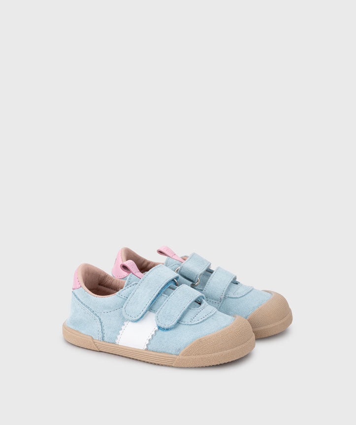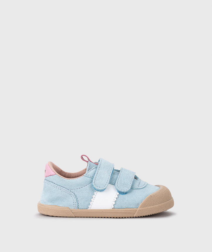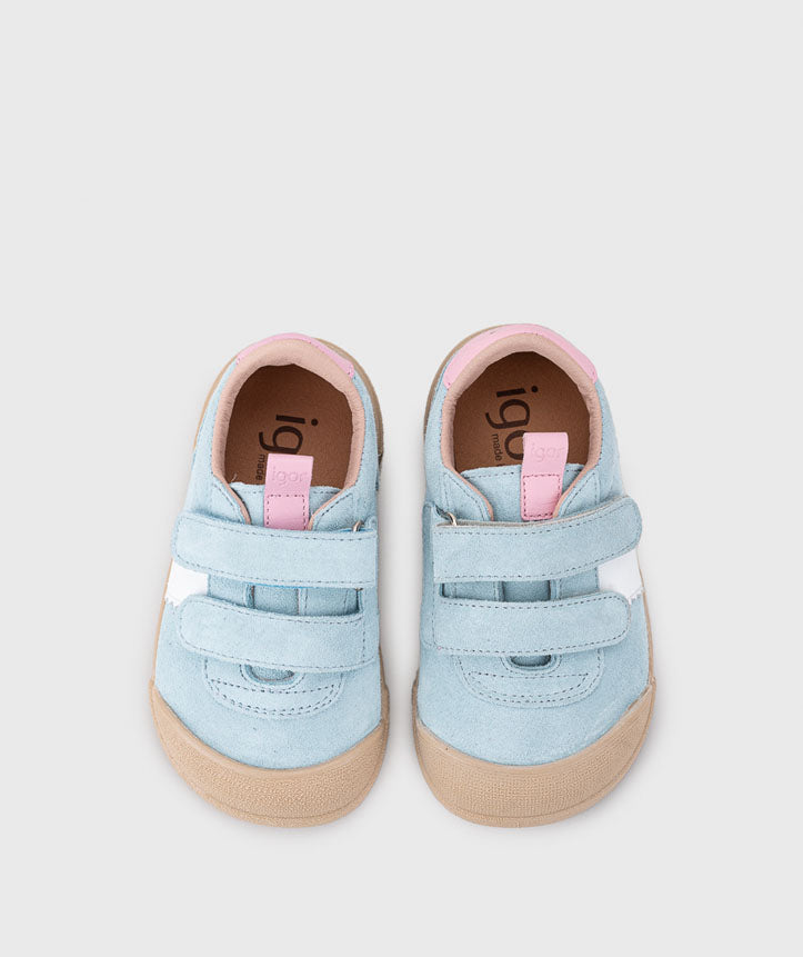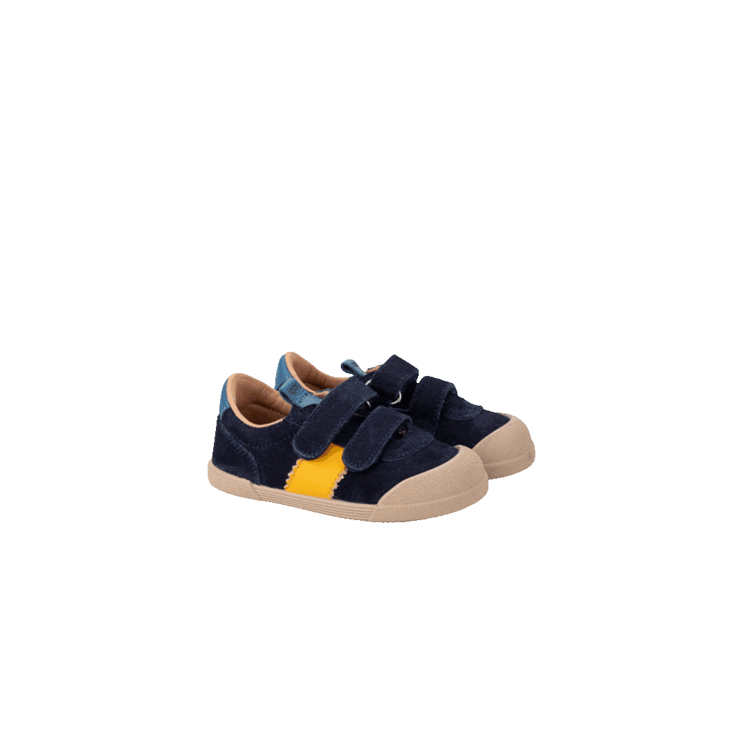 Tênis em camurça com o conceito barefoot wide, especialmente desenhados com biqueira mais larga para dar espaço natural aos dedos e maior conforto. Oferecem zero drop, são flexíveis, macios e incluem palmilha removível. O fecho em tira facilita o ajuste e promove a independência.