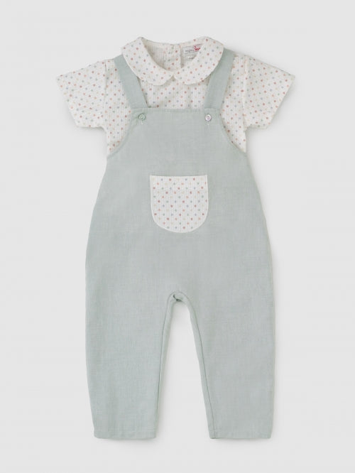 Inclui uma jardineira verde menta em algodão texturizado, com bolso frontal decorativo a combinar com a blusa, e uma blusa de mangas curtas com gola peter pan, em padrão de pequenas estrelas coloridas.