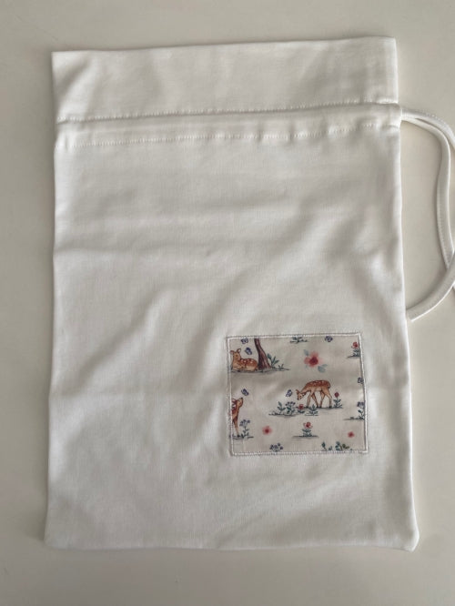 O saco 1ª roupinha Olie é o acessório perfeito para guardar os primeiros conjuntos do bebé, com toda a delicadeza que este momento pede. Feito em 100% algodão, é macio, resistente e fácil de transportar para a maternidade. O detalhe em tecido estampado com veados e flores dá-lhe um toque doce e natural, que evoca a serenidade da floresta.