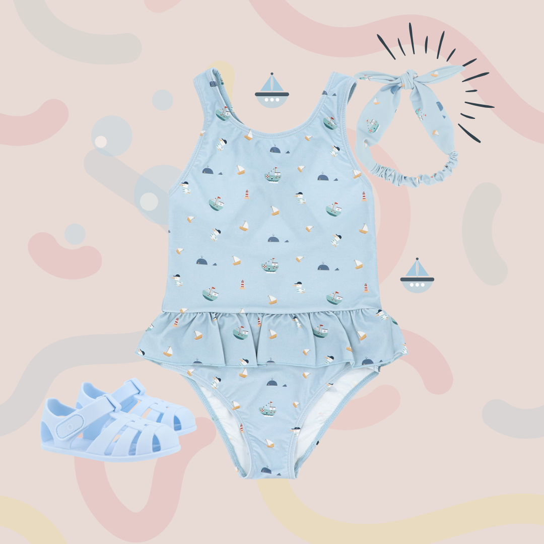Inspirado nas aventuras à beira-mar, este conjunto inclui o Fato de Banho Monnëka Fishing Boat, com costas cruzadas e um padrão náutico encantador, a Fita para Cabelo Monnëka Fishing Boat, para completar o look com delicadeza, e as Sandálias Barefoot Monnëka, que garantem conforto e liberdade nos passinhos de verão.