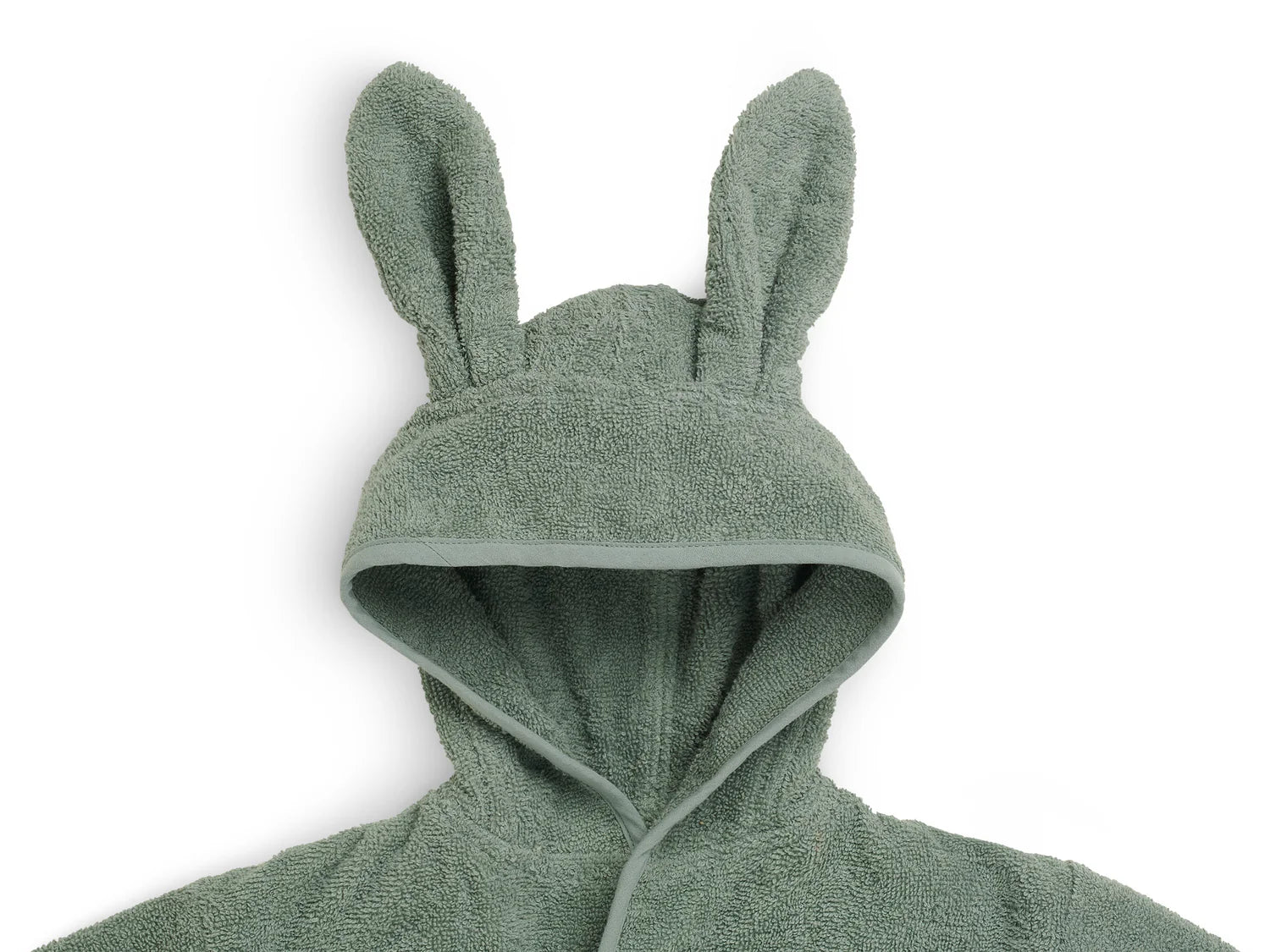 O capuz alegre com orelhas ajuda a secar o cabelo, enquanto o fecho com mola de pressão e o elástico nas costas garantem um ajuste confortável. A fita de atar está presa ao roupão, evitando que se perca.