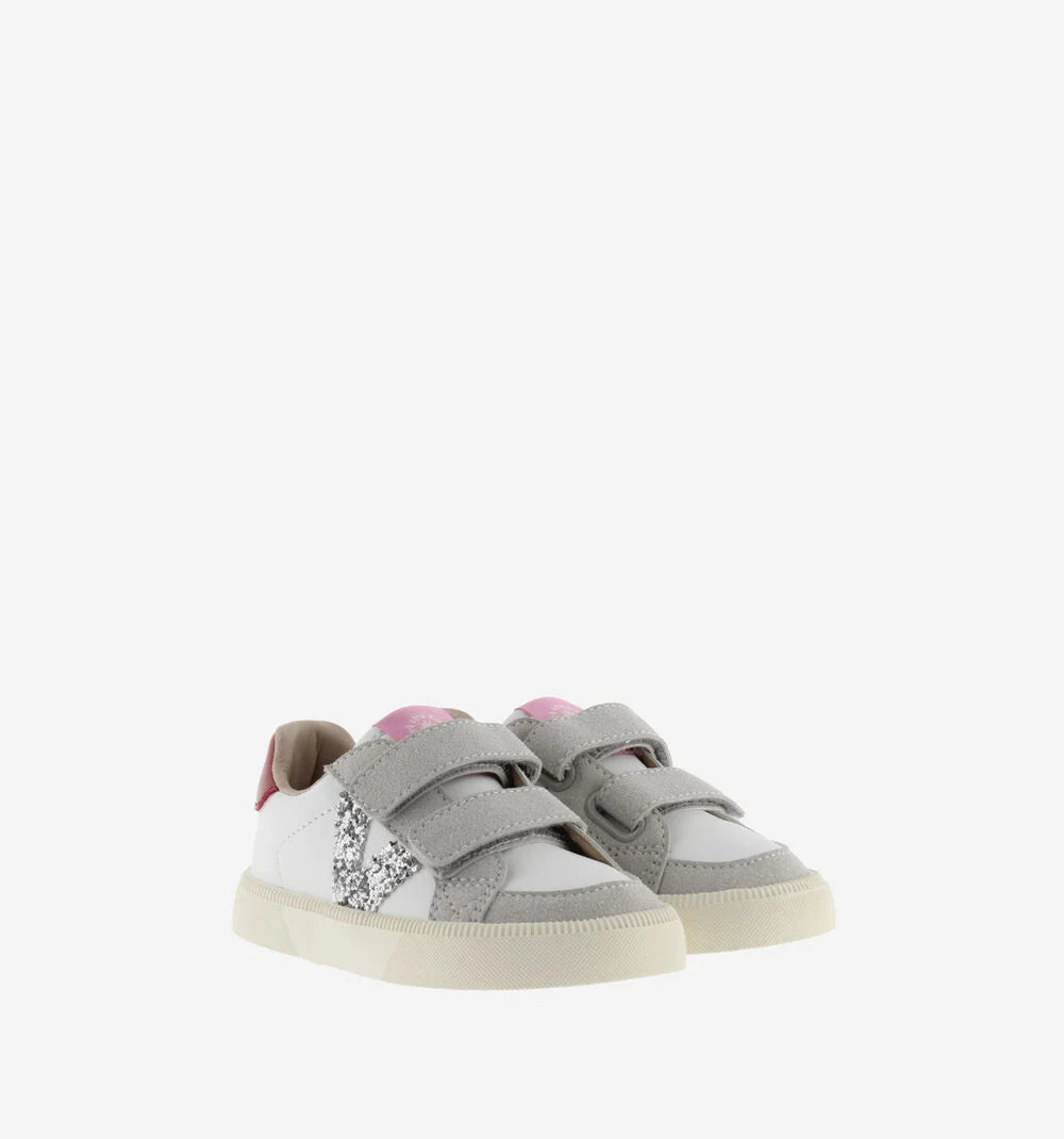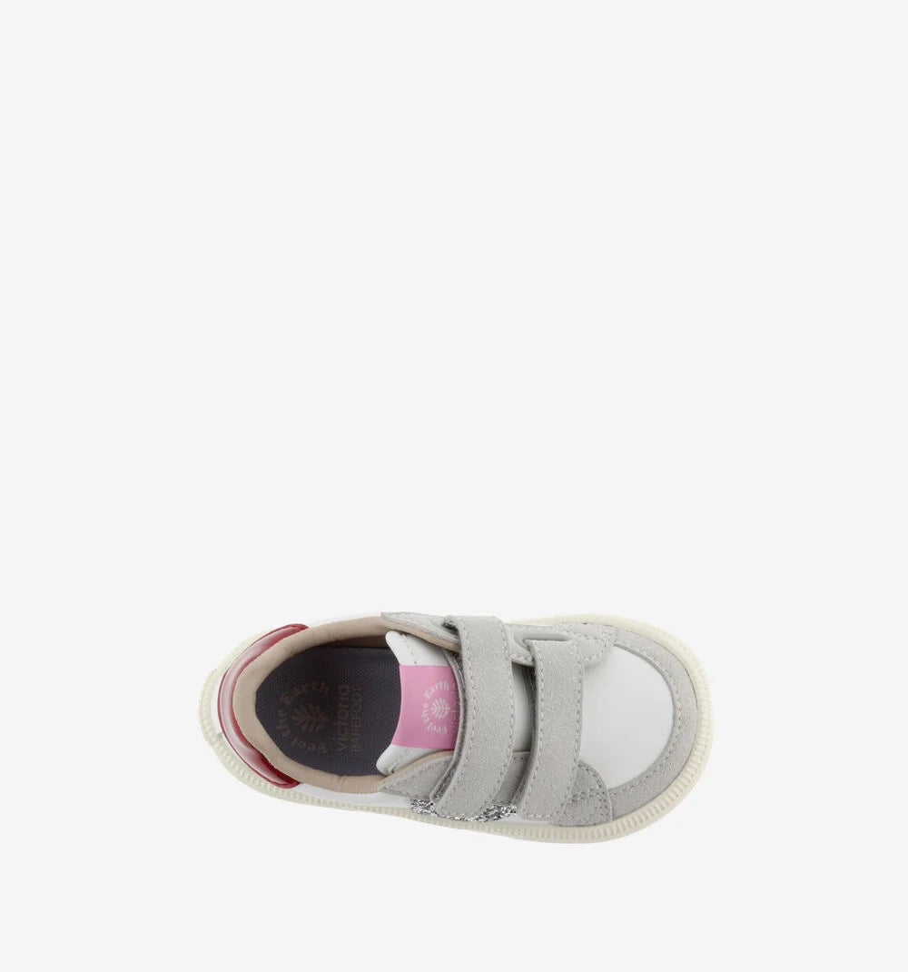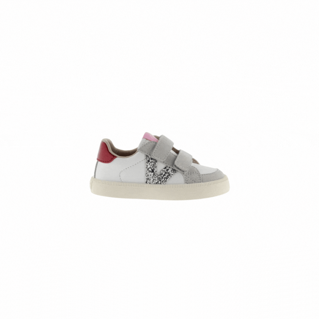 Sapatilhas desportivas barefoot pensadas para os mais pequenos, com acabamento em material sintético que simula pele. Apresentam um toque divertido com o V lateral em glitter prateado e um detalhe colorido na parte traseira. Fecho prático com duas tiras aderentes, para maior ajuste. A sola de borracha ambarada é leve, flexível e ideal para acompanhar o crescimento com conforto.