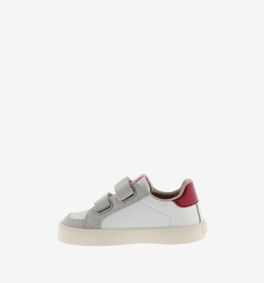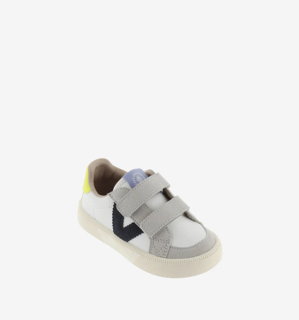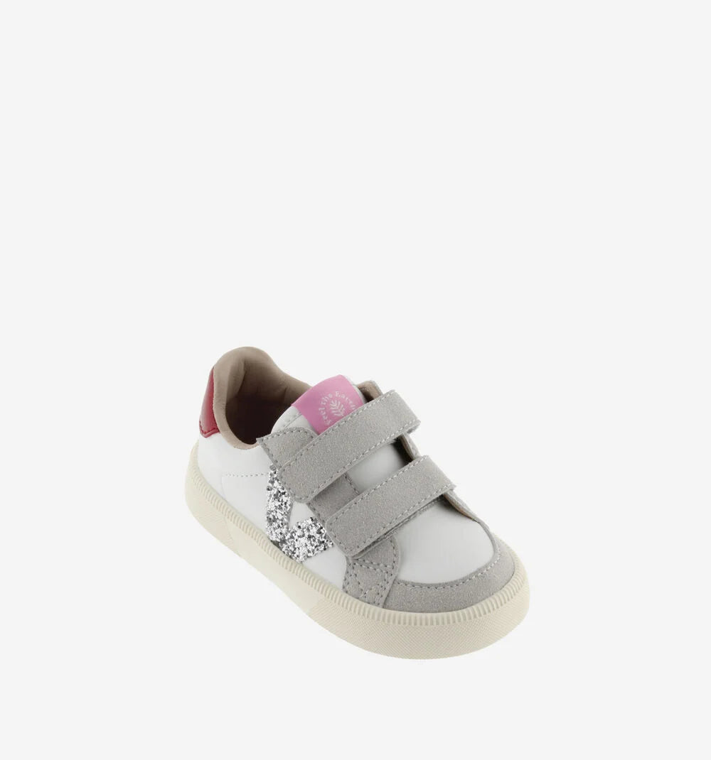 Sapatilhas desportivas barefoot pensadas para os mais pequenos, com acabamento em material sintético que simula pele. Apresentam um toque divertido com o V lateral em glitter prateado e um detalhe colorido na parte traseira. Fecho prático com duas tiras aderentes, para maior ajuste. A sola de borracha ambarada é leve, flexível e ideal para acompanhar o crescimento com conforto.