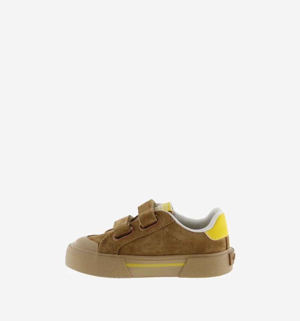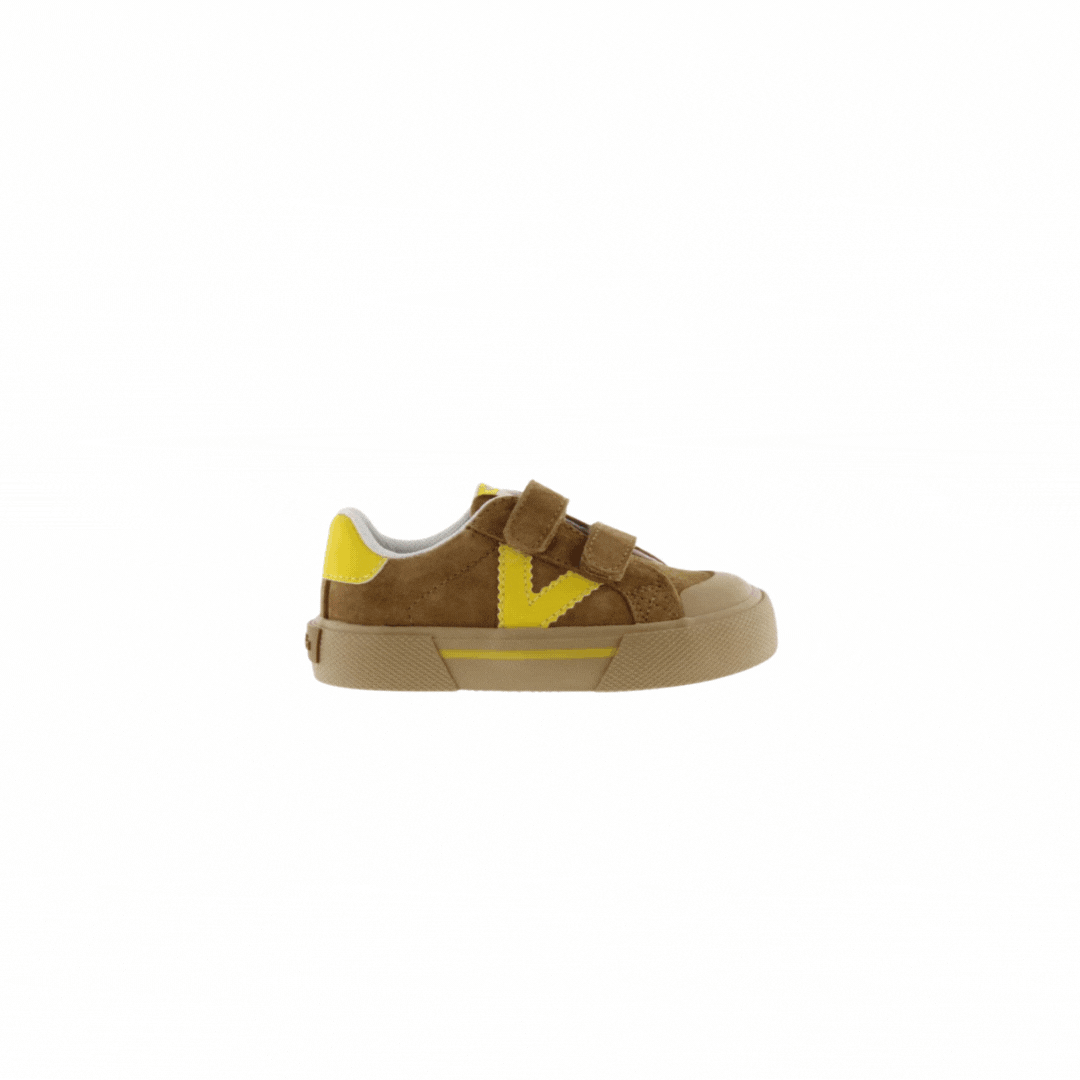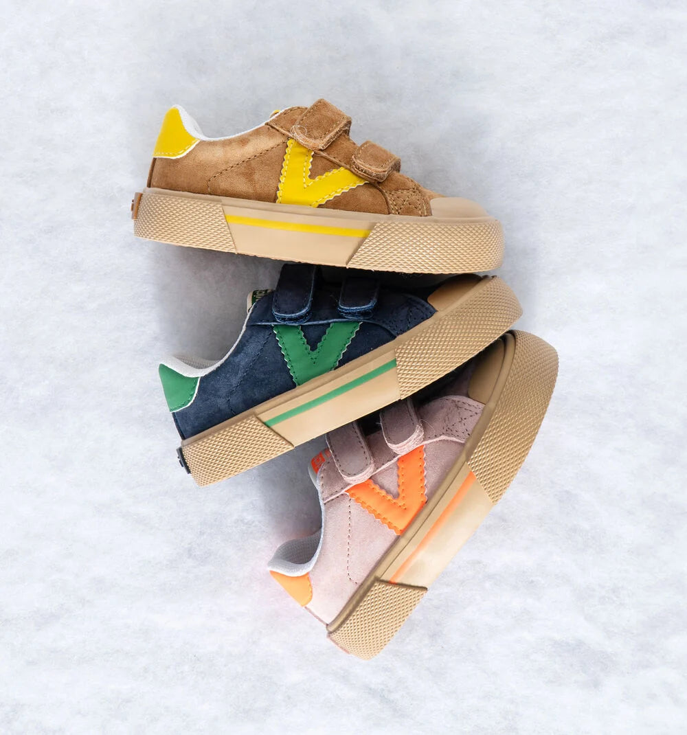 Sapatilhas desportivas com design contrastante e visual moderno. Fabricadas em crosta de pele e peças sintéticas, estas sapatilhas destacam-se pelo V lateral e o detalhe no calcanhar em tons vivos. As duas tiras aderentes tornam o calçar mais fácil e garantem uma fixação segura. A sola de borracha caramelo, com reforço na biqueira, aumenta a resistência ao uso diário.