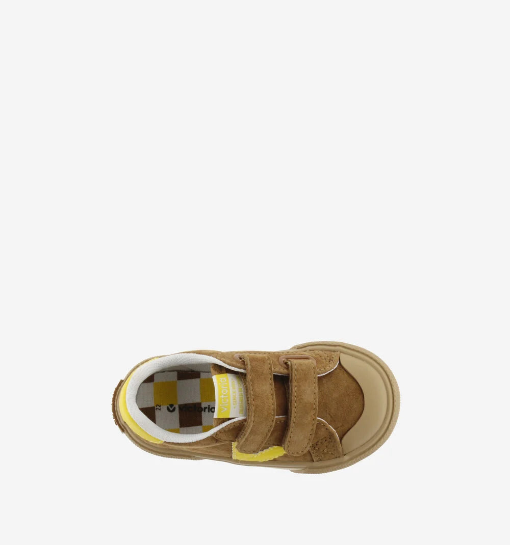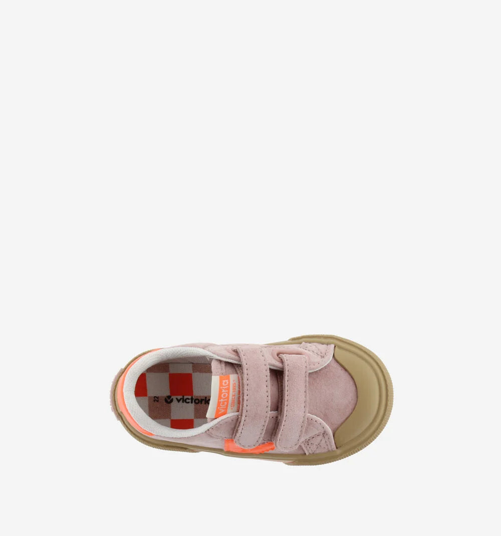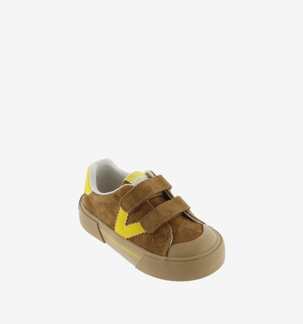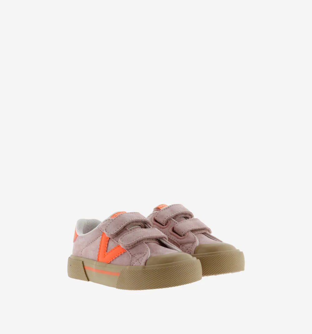 Sapatilhas desportivas com design contrastante e visual moderno. Fabricadas em crosta de pele e peças sintéticas, estas sapatilhas destacam-se pelo V lateral e o detalhe no calcanhar em tons vivos. As duas tiras aderentes tornam o calçar mais fácil e garantem uma fixação segura. A sola de borracha caramelo, com reforço na biqueira, aumenta a resistência ao uso diário.