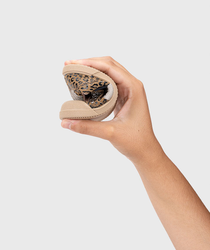 Tênis casuais com padrão leopardo, pensados para quem procura estilo aliado ao conforto. Desenvolvidos com conceito barefoot médio, oferecem a sensação natural de andar descalço. Possuem zero drop, são flexíveis e macios, incluem palmilha removível e contam com fecho em tira para um ajuste fácil e autonomia.