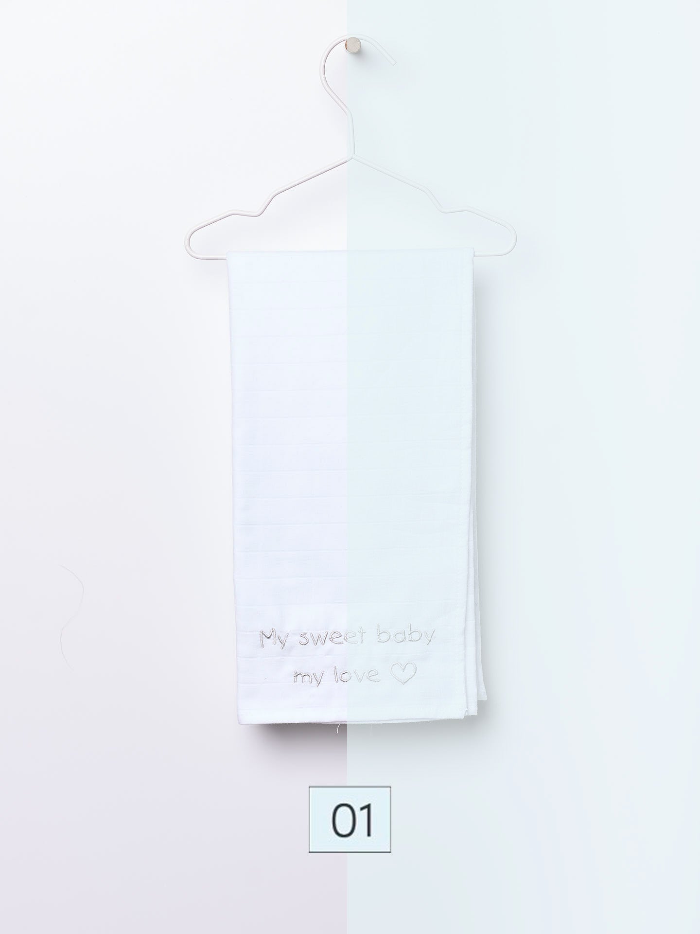 Da Cápsula Mini Bebés, esta fralda de pano branca é bordada com as palavras "My sweet baby", disponível em várias cores. Produzida em algodão suave, é indicada para bebés, meninos e meninas.
